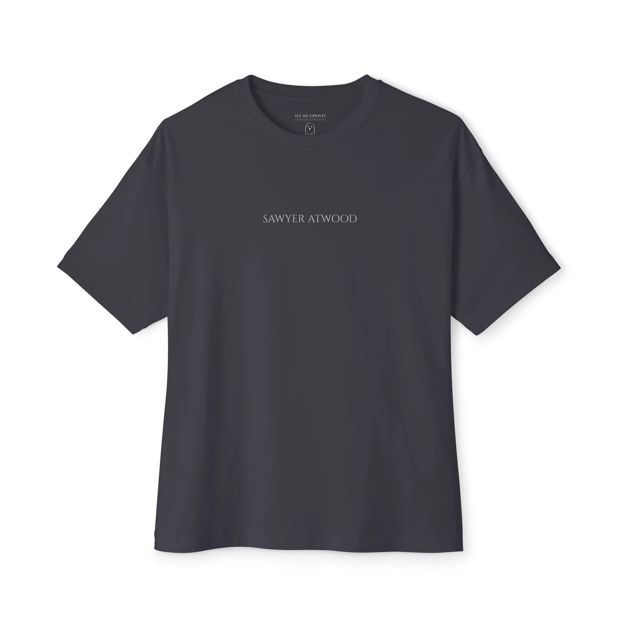 Unisex oversized boxy tee in black featuring "sawyer atwood" printed on the front and "if it felt real, was it?" repeated on the back.